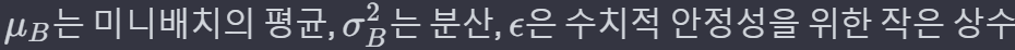 - 이는 데이터를 학습 간 전체 데이터를 한번에 학습하기에 제한되는 경우(컴퓨팅 능력등의 제한 등으로)에 미니 배치(mini-batch) 단위로 학습을 진행하는데, 이때 학습과정을 가속화하고 안정화시키기 위해 각 미니배치의 출력에 대해 평균과 분산을 계산하고 이를 사용해 미니배치의 출력을 정규화하는 방법을 말한다.